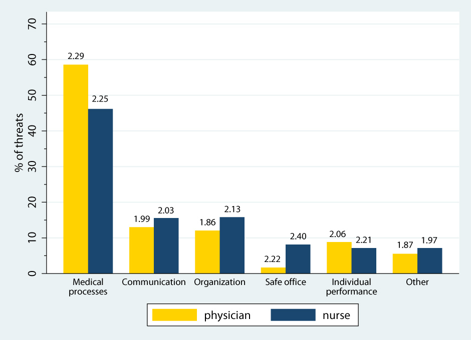 With the respondent as unit of analyses, 57% of individual responders specified at least one medication related threat and 24% described at least one procedure related threat (X-ray, vaccination, emergencies, other). The eight categories medication (general), interactions, diagnosis, stress, vaccination, triage, confusion of patients and hygiene covered the top priority threats of 48.9% of physicians and 42.6% of nurses.
