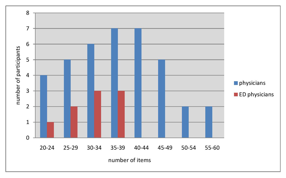 As shown in table 2, the mean (SD) number of items chosen by internists was 37.4 (10.2), and 31.6 (6.2) chosen by emergency physicians, respectively. The difference between the two groups proved to be not statistically significant (t (45) = 1.64, p = 0.11, d = 0.41 ). The distribution of the number of items, chosen by internists and by emergency physicians, respectively, is shown in figure 1.