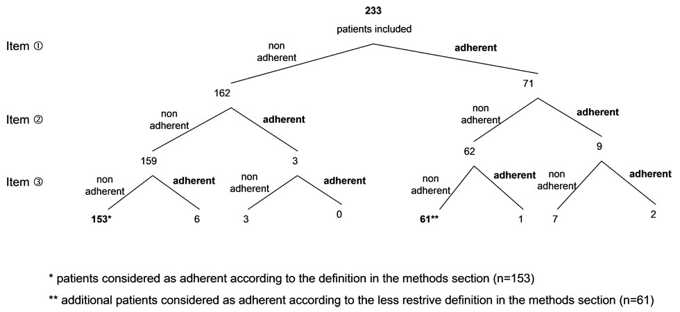 A patient was considered adherent according to the first three items that is if he/she answered he/she always takes his/her medication (“In which circumstances did you not taken your HIV-medication?” “It never happens to me, I always take my medication”), and he/she never stopped taking his/her medicine when he/she felt better or worse (“When you feel better, do you sometimes stop taking your medicine?” “No”, and “Sometimes if you feel worse when you take the medicine, do you stop taking it?” “No”). In all other cases (answers converging to nonadherence or divergent answers), the patient was considered to be non-adherent. A sensitivity analysis was performed using a less restrictive definition for adherence: a patient was considered adherent if he/she never stopped taking his/her medicine when he/she felt better or worse (items 2 and 3).