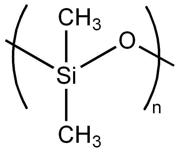 Silicones [3] should not be confused with the chemical element, silicon, which is part of the composition of silicones. Silicones are peculiar. Unlike many other silicon-containing compounds or materials (e.g., SiO2, quartz mineral) silicones do not occur in nature. They are entirely synthetic. They were first synthesised ca. 1900, and the term “silicones” was invented to describe them. Silicones are polymerised siloxanes (a.k.a. polysiloxanes). They are mixed inorganic-organic polymers with the chemical formula (R2SiO)n where R is an organic side group (e.g., methyl, CH3) attached to a siloxane ...-Si-O-Si-O-Si-O-... “backbone” or chain (fig. 2A, B). The specific example shown, polydimethylsiloxane (PDMS), is the most common polysiloxane [4]. Since the chains must be terminated, the complete PDMS formula is CH3[Si(CH3)2O]nSi(CH3)3. PDMS is an oily, sticky liquid with a viscosity that increases as the average chain length (molecular weight) is increased.