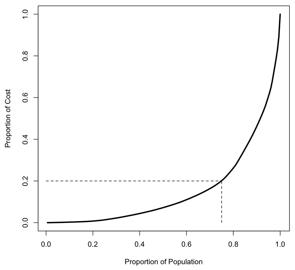 In health economics analysis, a highly skewed distribution of treatment costs is a common phenomenon. To analyse the concentration of the total costs in our sample, we calculated the Gini-coefficient [24]. This measure represents the dispersion of costs across patients. A coefficient of zero would imply that treatment costs are the same for all patients. A value of one on the other hand would indicate that one single person incurs all costs. We then calculated a cost-concentration curve, which in turn informed the logistic regression analysis of the probability of being a high-cost case.