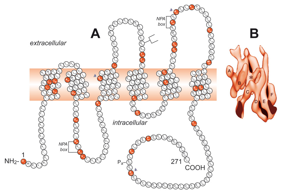 A Schematic representation of the aquaporin-2 protein and identification of 46 AQP2 mutations. A monomer is represented with six transmembrane helices. The location of the protein kinase A phosphorylation site (Pa) is indicated. The extracellular, transmembrane, and cytoplasmic domains are defined according to Deen et al. [82] Solid symbols indicate the mutations’ location.
