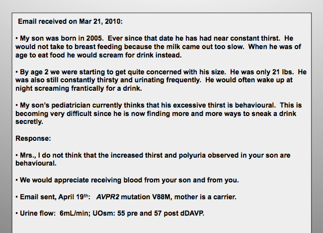 We are recommending the sequencing of the nephrogenic diabetes insipidus genes in all the affected patients. The genes involved are, with a few exceptions, relatively small and easy to sequence. This genomic information is key to the routine care of patients with congenital polyuria and, as in other genetic diseases, reduces health costs and provides psychological benefits to patients and families [79] (fig. 8).
