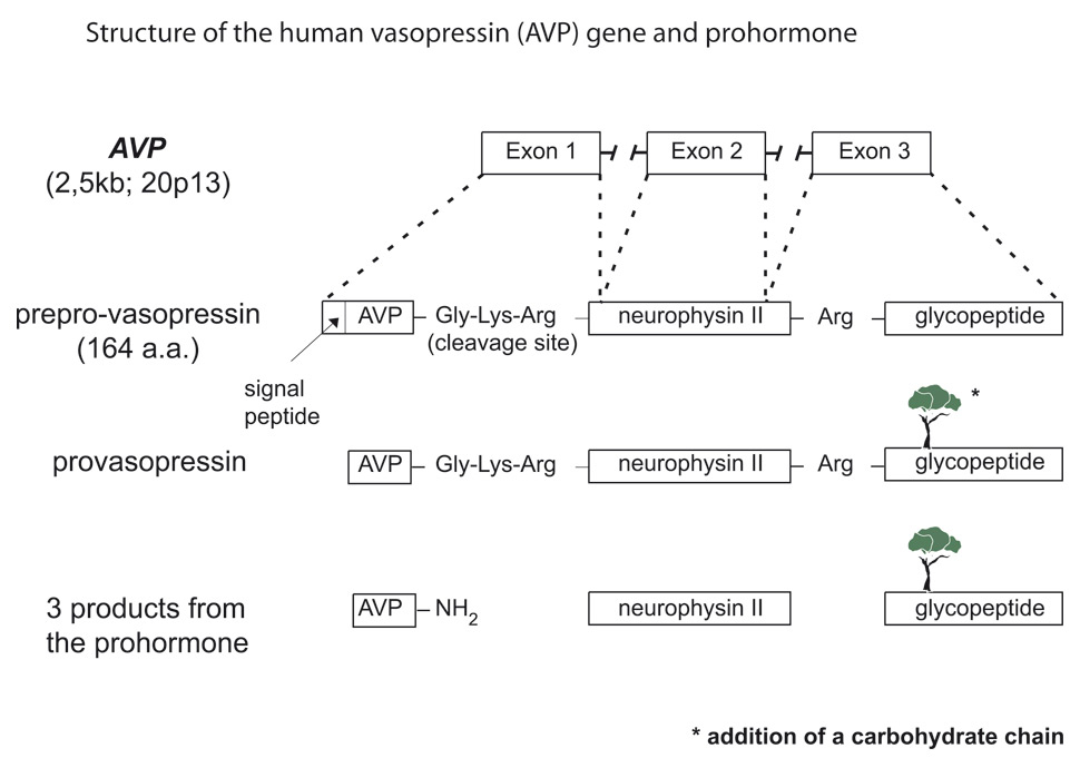 Structure of the human vasopressin (AVP) gene and cascade of vasopressin biosynthesis, signal peptide; AVP, arginine-vasopressin; neurophysin; glycoprotein.