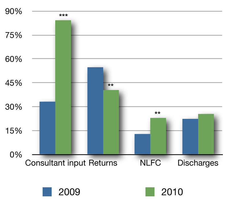 The proportion of cases receiving consultant input increased significantly from 33% in 2009 to 84% in 2010 (98 versus 202 patients, p <0.0001). The proportion of patients requiring physical review by a consultant fell by 21% (89 versus 22 patients, p <0.0001). Overall ‘return rates’ were reduced significantly by 14% (162 versus 97 patients, p = 0.013) and utilization of the nurse-led fracture clinic improved significantly by 10% (38 versus 55 referrals, p = 0.0028). The discharge rate improved from 22% in 2009 to 25% in 2010, but did not reach significance (66 versus 61 patients, p = 0.42; fig. 3).