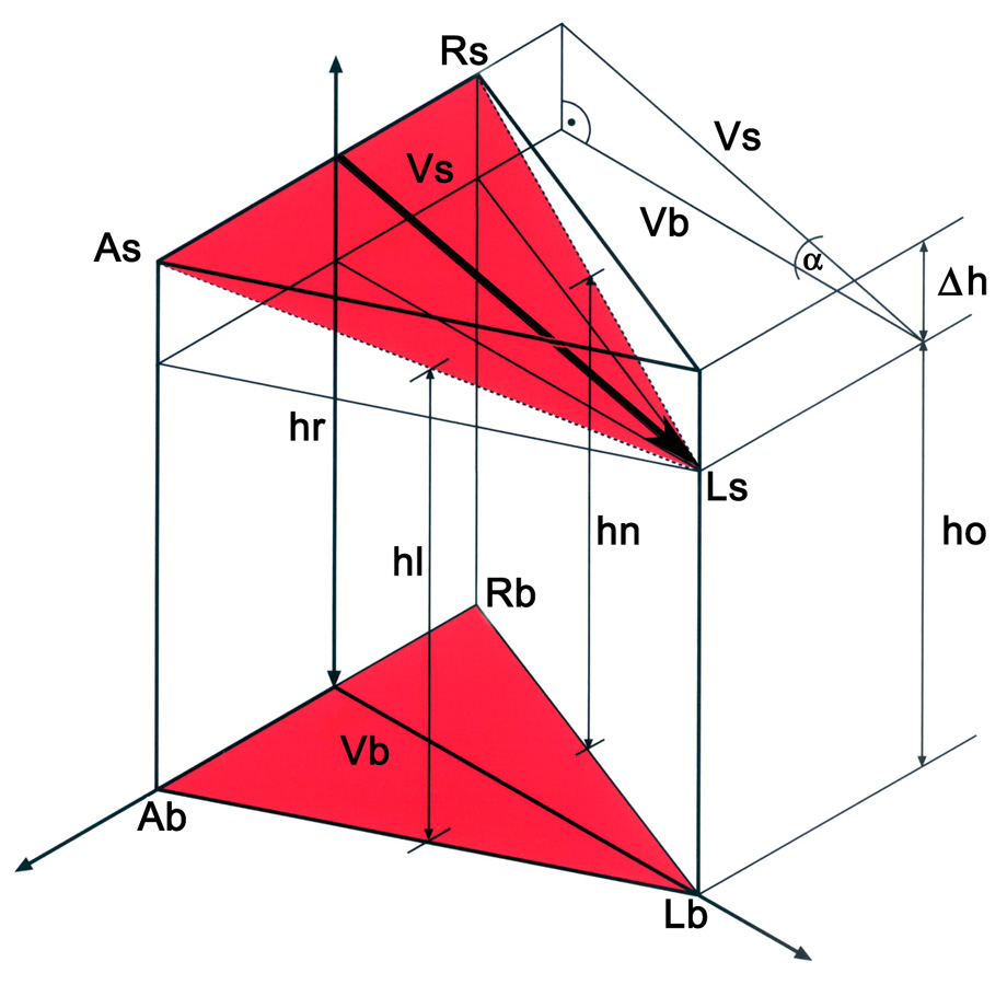 1/A Geometric model of the aortic root. The ‘AsRsLs’ triangle is positioned in the sinutubular junction. The three edges correspond to the anterior (As), right (Rs) and left (Ls) commissures. The triangle at the aortic root base is marked by the ‘AbRbLb’ triangle, where the basal points correspond to the vertical projection of the three commissures into the root base. By interconnecting the points of both triangles, a model of the aortic root is obtained. ‘hr’ corresponds to the height measured in the right sinus; ‘hl’ and ‘hn’ to the heights obtained in the left and non-coronary sinuses, respectively. ‘ho’ is the distance between the ‘Ls’ and ‘Lb’ respectively. ‘∆h’ is calculated as the difference between ‘hr’ and ‘ho’. The ‘Vs’ height of the ‘AsRsLs’ triangle also was calculated. One can observe that the tilt angle between the basal and sinutubular triangles corresponds to the ‘α’ angle in the triangle, which is defined by ‘∆h’ and ‘Vs’. The ‘α’ angle is calculated according to the rules of a right-angle triangle. The tilt angle of the aortic root is 5.47°