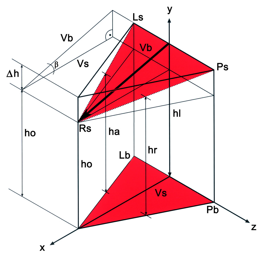1/B Geometric model of the pulmonary root. The ‘PsLsRs’ triangle is found at the level of the sinutubular junction and is defined by the posterior (Ps), left (Rs) and right (Rs) commissures. The triangle at the aortic root base is marked by the ‘PbLbRb’ triangle, where the basal points correspond to projection of the commissures onto the inter-valvular triangles. By interconnecting the mentioned points, a 3-D model of the pulmonary root is obtained. ‘hl’ corresponds to the height measured in the left sinus; ‘ha’ and ‘hr’ to the heights obtained in the anterior and in the right pulmonary sinuses, respectively. ‘ho’ is the distance between ‘Rs’ and ‘Rb’. ‘∆h’ is calculated as the difference between ‘hl’ and ‘ho’. ‘Vs’ is the height of the ‘PsLsRs’ triangle, which also was calculated. One can observe that the tilt angle between the basal and sinutubular triangles corresponds to the ‘β’ angle in the triangle, which is defined by ‘∆h’ and ‘Vs’. The ‘β’ angle is calculated according to the rules of a right-angle triangle. The tilt angle of the pulmonary root is 16.26°.