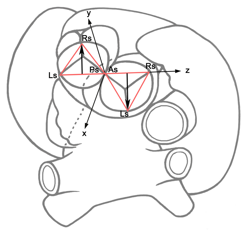 Superior view of the aortic and pulmonary roots. The sinutubular triangles in the aortic (‘AsRsLs’) and pulmonary roots (‘PsLsRs’) are indicated. The root vectors were positioned parallel to each other in opposite directions. The common frame of reference was positioned with its origin just between the posterior commissure of the pulmonary root and the anterior commissure of the aortic root. The x-axis runs toward the left atrium, the z-axis toward the right auricle, and the y-axis is perpendicular to the ‘x-z’ plane. Note that the stretch ‘LsPs’ of the pulmonary root and the stretch ‘AsRs’ of the aortic root are positioned along the z-axis. Consequently, the directions of the root vectors are opposite, but parallel.