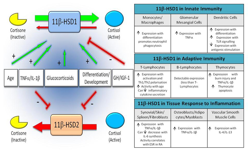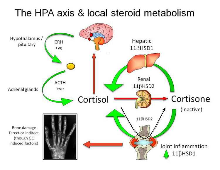In addition to regulation of GCs via the HPA axis, there is a growing body of work demonstrating the importance of 11β-HSD1 in regulating local GC levels during inflammation in vivo [43]. At the tissue level in patients with colitis or inflammatory bowel disease, 11β-HSD1 is increased, whilst 11β-HSD2 expression is decreased compared to normal controls [44, 45]. Similarly, when looking at inflamed synovium isolated from patients with either RA or osteoarthritis, there is a marked increase in both 11β-HSD1 expression and its associated steroid activating activity [26]. Furthermore, within the synovium of RA patients it was shown that the capacity for the tissue to generate cortisol correlated with disease activity. This was mirrored in systemic measures of 11β-HSD1 activity in these individuals (based on urinary corticosteroid metabolite analysis), with the greatest activity being seen in patients with the highest levels of CRP and ESR.
