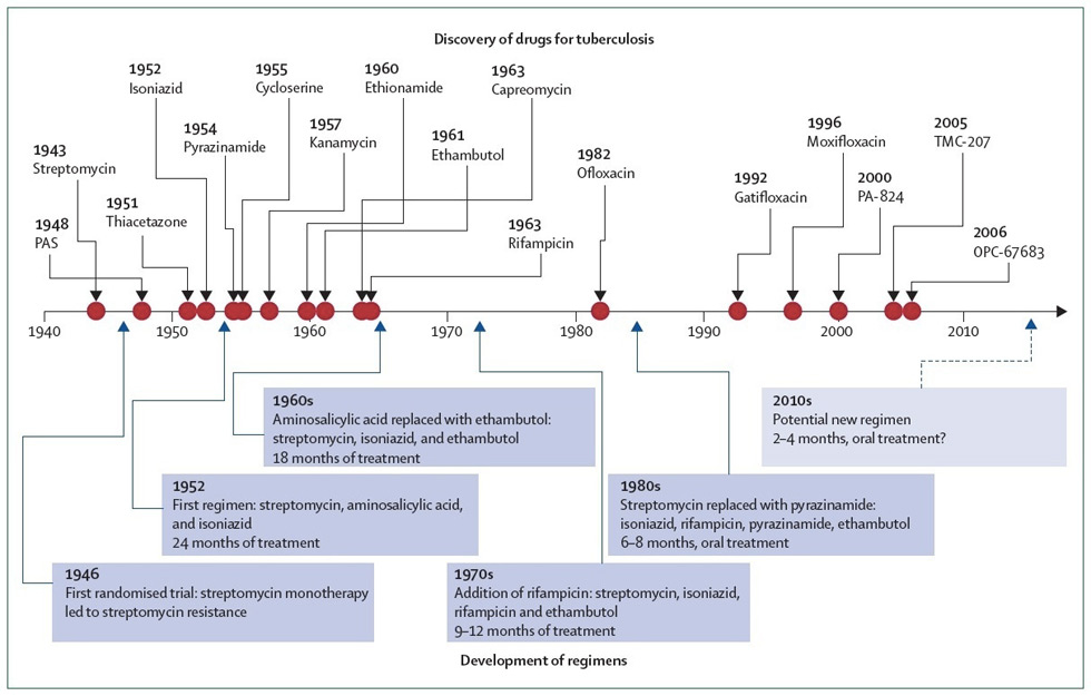 History of drug discovery and development of treatment regimens for tuberculosis. Compounds that are in the early-stage of development, but for which there are no published human proof-of-concept data, are not shown. Arrow with dashed line represents a possible future regimen. Red dots represent when the drugs were first reported. (From [51]: Ma Z, Lienhardt C, McIlleron H, Nunn AJ, Wang X. Global tuberculosis drug development pipeline: the need and the reality. Lancet. 2010;375(9731):2100–9. Copyright 2012, with permission from Elsevier, Oxford, UK.)
