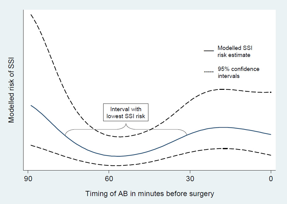 Risk of surgical site infection by timing of surgical antimicrobial prophylaxis. The lowest risk of surgical site infection was observed when the antibiotics were administered between 74 and 30 minutes before surgery.