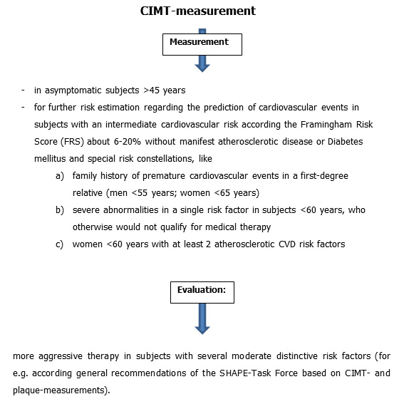 Up to today, risk factors are used to classify cardiovascular risk as low, intermediate and high risk. Subjects with a low risk are recommended to modify risk factors, while high-risk subjects receive medical therapy. The management for subjects with an intermediate risk is unsettled. These persons are recommended for further risk assessment including new markers of a subclinical atherosclerosis (for example CIMT-measurement). However, the value of CIMT-measurement in the cardiovascular risk stratification is still under debate.