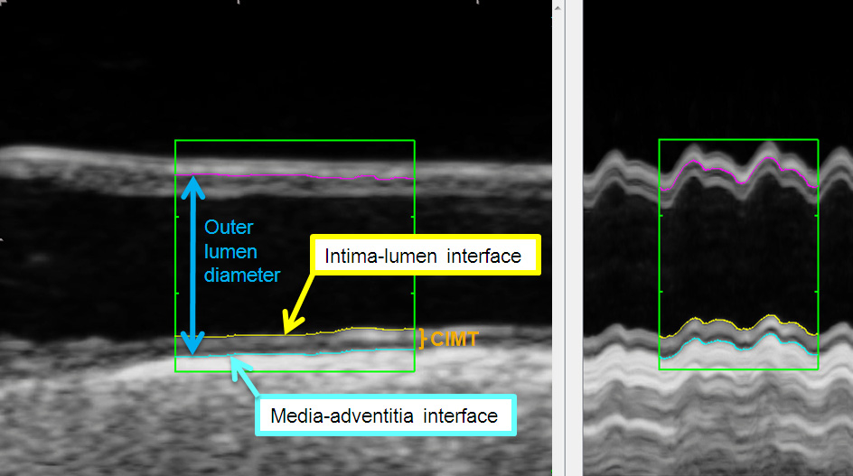 Carotid intima-media thickness (CIMT), recorded with B-mode sonography, is an important marker to quantify atherosclerotic burden in the common carotid artery (CCA). The last twenty years, the value of CIMT-measurement for risk estimation of atherosclerotic events (for e.g., myocardial infarction, stroke, sudden cardiac death) increased more than ever.