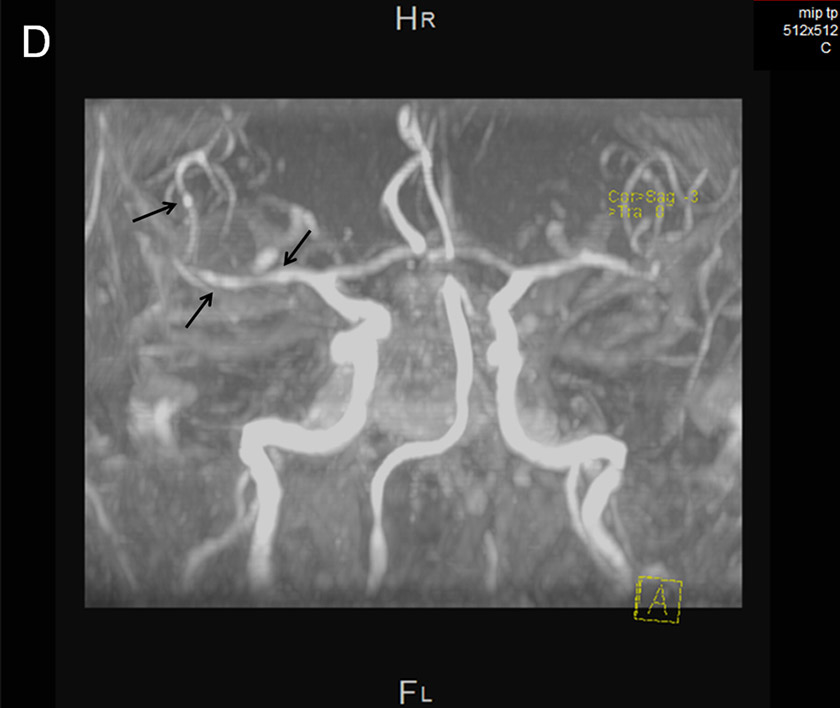 D MR angiography: Arrows highlight arterial irregularities suggestive of vasculitis.