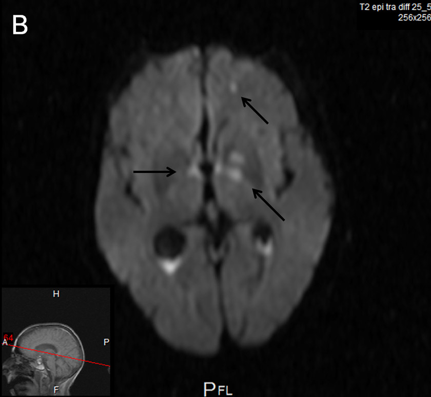 A, B Axial diffusion-weighted images: Areas of ischaemic necrosis in the pons (A), and thalami and basal ganglia bilaterally (B).