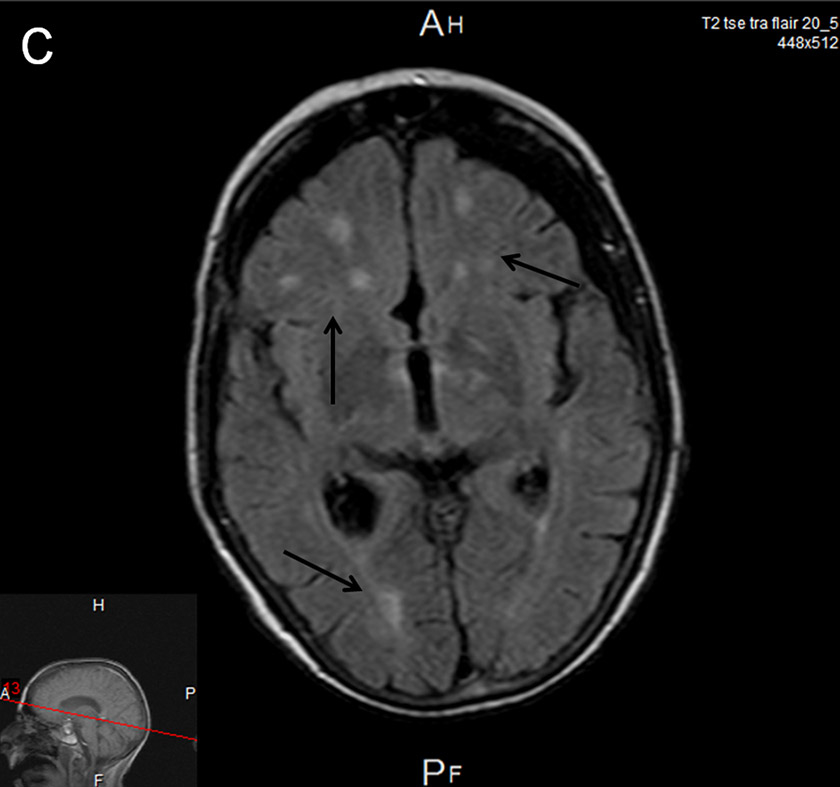 C Axial FLAIR image: Areas of ischaemia in the subcortical anterior and posterior territories.