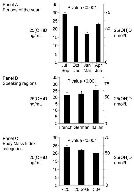 The overall adjusted mean 25(OH)D level was 23.1 ng/ml (57.7 nmol/l) (95%CI: 22.6–23.6 [56.4–58.9]). The adjusted 25(OH)D mean was associated with the period of the year and speaking regions (fig. 1, panel A and B). Among all subjects, the adjusted 25(OH)D mean was 22.1 ng/ml (55.2 nmol/l) (20.3–24.1 ng/ml [50.7–60.2 nmol/l]), 22.9 ng/ml (57.2 nmol/l) (95%CI: 21.2–24.6 [52.9–61.4]), and 26.1 ng/ml (65.1 nmol/l) (95%CI: 23.2–29.1 [57.9–72.6]), respectively in the French-, German-, and Italian-speaking regions (p-value <0.001). The numbers (%) of participants not taking vitamin D supplementation or treatment by speaking regions were as follows: French-speaking n = 362 (95.3%), German-speaking n = 707 (96.2%), Italian-speaking n = 188 (96.9%). Differences across speaking regions remained significant when restricted to participants without vitamin D supplements or treatments: 21.7 ng/ml (54.2 nmol/l) (95%CI: 19.8‒23.7 [49.4–59.2]), 22.6 ng/ml (56.4 nmol/l) (95%CI: 20.9–24.4 [52.2–60.9]), and 25.6 ng/ml (63.9 nmol/l) (95%CI: 22.9–29.0 [57.2–72.4]), p-value <0.001.