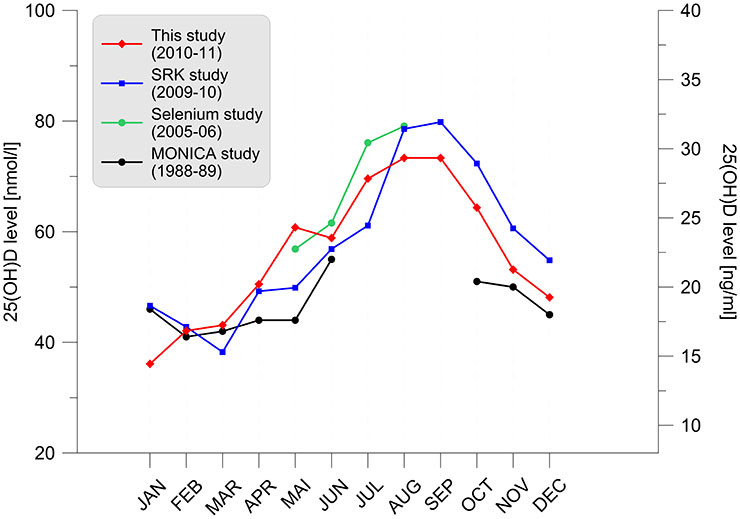 In the SRK study (personal communication, manuscript in preparation), some 120 samples were obtained each month between December 2009 and November 2010 from the region of Bern (for a total of 1,582 samples). The sampling was designed to have a representative sample of blood donors with respect to sex and age. Serum samples in the SRK and Selenium studies were obtained from regular blood donors in blood bank centres of the Swiss Red Cross. In the SRK and the Selenium studies, 25(OH)D concentration was assessed by the same analytical method as the one used in the present study (i.e. Swiss Study on Salt Intake) while in the MONICA study vitamin D was measured by radioimmunoassay.
