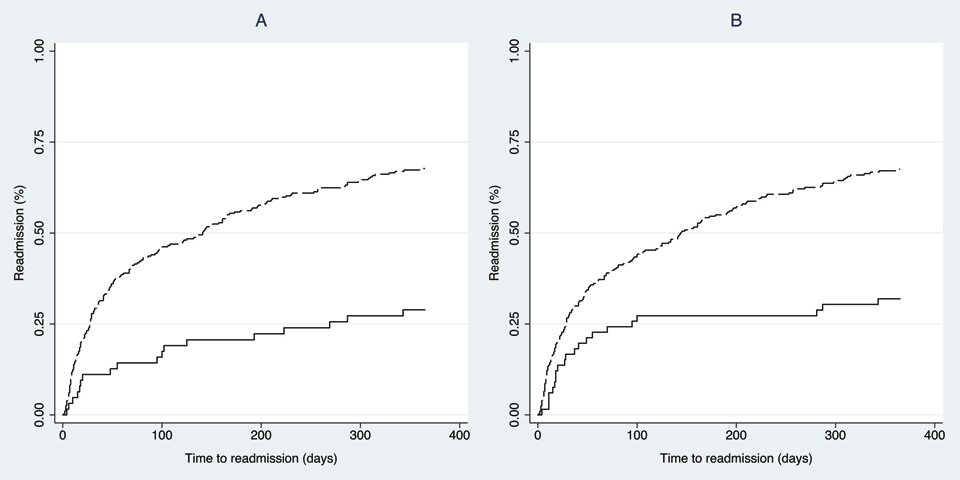 Figure 3 shows the Kaplan-Meyer estimation curves for readmission according to a positive or negative ISAR or TRST scores. The curves of patients readmitted or were not statistically different (p <0.001) with both screening tools.