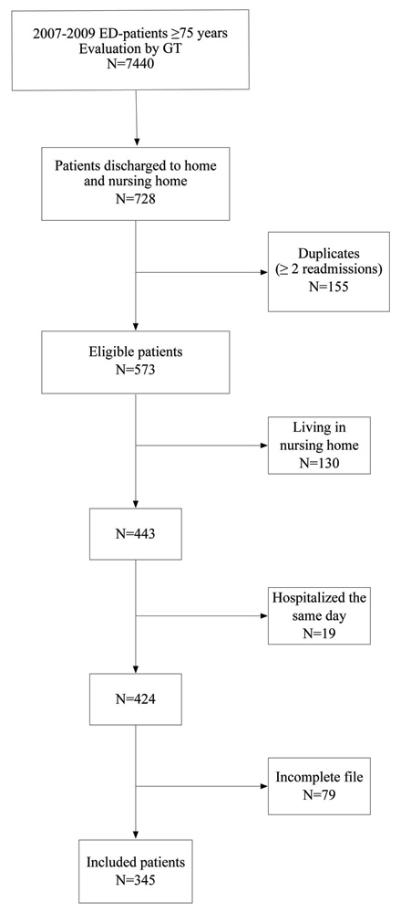 We included all patients seen by the GT during a 3-year period (2007–2009) and discharged to home from the ED. Patients living in nursing homes were excluded. All data were systematically collected when the patient was seen in the ED by a physician of the GT, and included in a database. The information was obtained either from the patient or from the caregiver.
