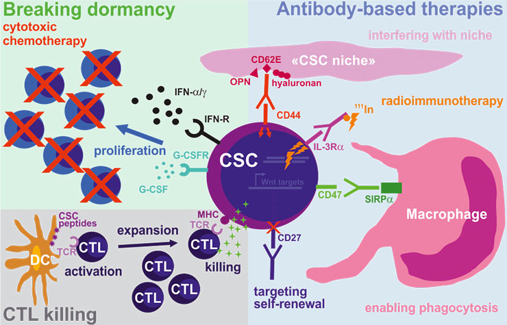 Targeting cancer stem cells (CSCs) using immunotherapy. As compared to the bulk of tumour cells, CSCs may also be targeted using antibody-based therapies by blocking pathways important for homing and engraftment (CD44), self-renewal (CD27), protection against phagocytosis (CD47) and by delivering radioactive compounds (IL-3Rα). In addition, strongly activated and expanded cytotoxic CD8+ T cells (CTLs) specific for CSC antigens are promising candidates for a potent and long-lasting elimination of CSCs. Finally, forcing CSCs into the cell-cycle by breaking their dormancy using proliferation-activating molecules, followed by conventional cytotoxic chemotherapy, may represent an attractive two-step strategy to eradicate CSCs.