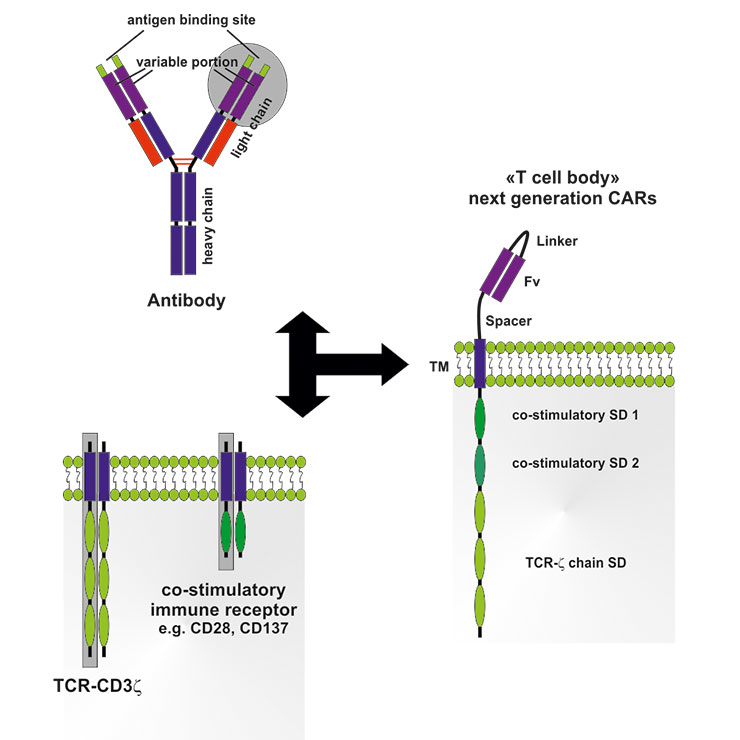 Structure and assembly of next-generation chimeric antigen receptors (CARs). CARs are comprised of the variable portion (Fv) from an antibody with a defined specificity for a tumour antigen linked via a transmembrane domain (TM) to intracellular signaling domains (SDs) from the T cell receptor (TCR)-complex (CD3ζ chain), as well as one or several SDs from co-stimulatory receptors (e.g. CD28, OX40, CD137). Consequently, T cells expressing genetically engineered CARs can be activated independent of antigen-presenting cells; recognition of tumour antigen by the Fv-portion results in full activation of T cells.