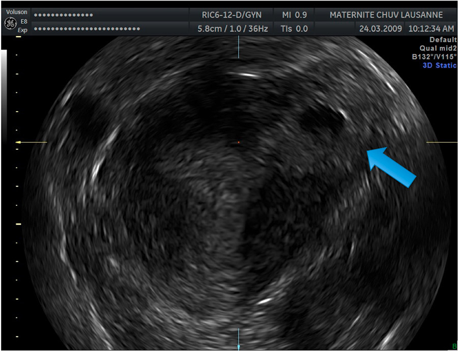 Progress in 3D TVUS makes this technique a good and precise diagnostic tool. In particular, the 3D reconstruction in a coronal sectional plane allows localisation of the GS in relation to the uterine cavity, therefore helping in differentiating the IP from an angular pregnancy [11–13] (fig. 4).