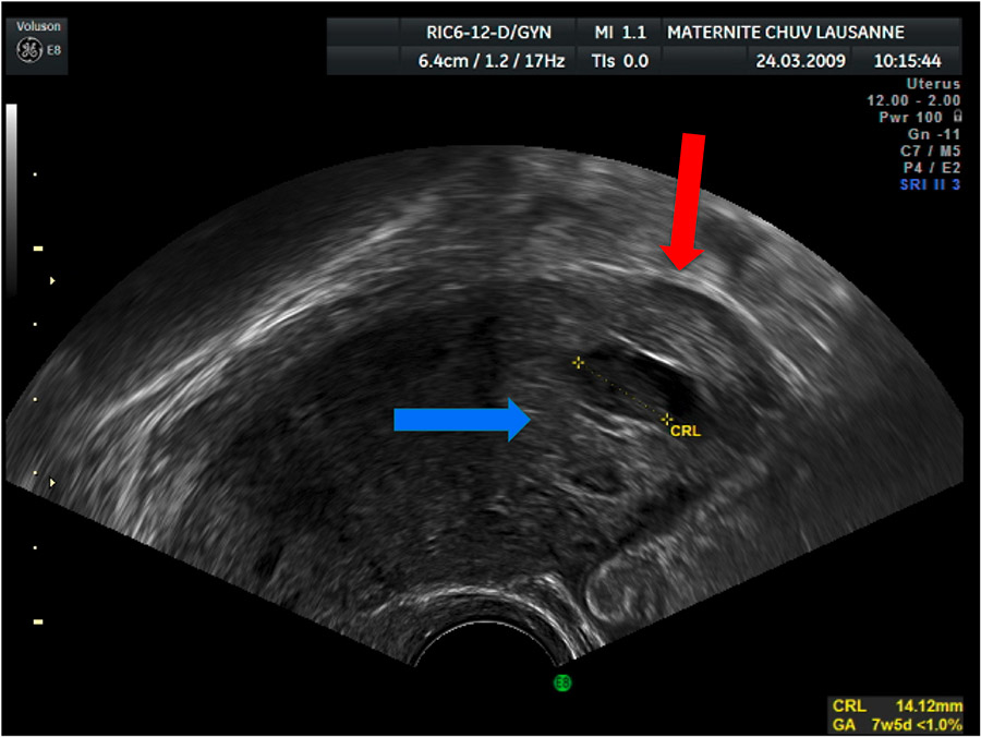 TVUS sagittal image showing an eccentric GS, blue arrow, surrounded by a thin myometrial layer, red arrow.