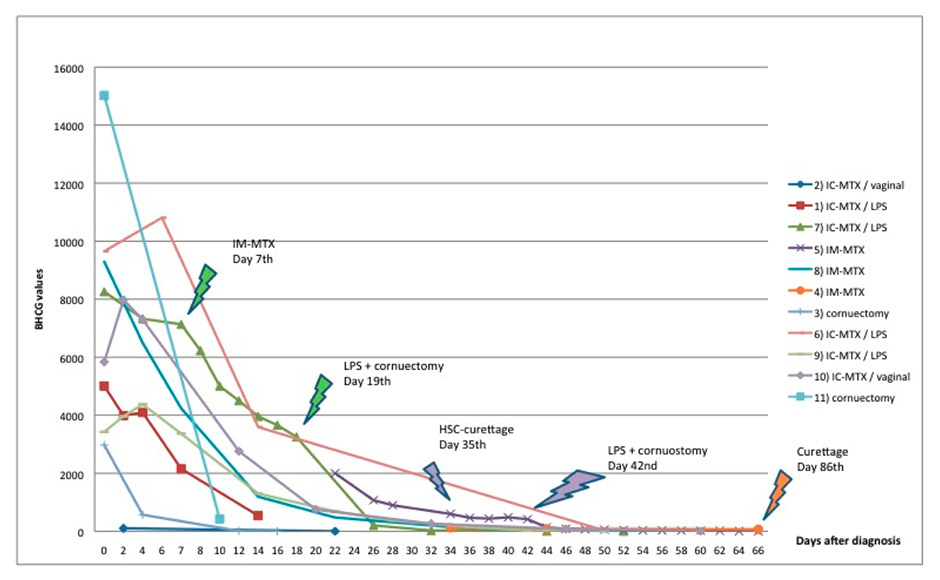 The follow-up consisted in monitoring the beta-HCG level decline (fig. 3). The median time to beta-HCG resolution was 58 days (range 22–132 days). In the six patients treated with MTX and who did not need a second intervention, the time to beta-HCG resolution was 58 days for the only patient treated with IM-MTX and between 22 and 59 days for the five patients treated with IC-MTX (with a median of 52 days).