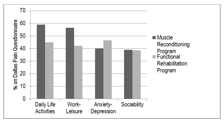 Results at follow-up for the two programmes for each of the Dallas Pain Questionnaire subscales. A difference was observed favouring the multidisciplinary functional rehabilitation programme in terms of “daily life activities” and “work-leisure” with a trend toward statistical significance.
