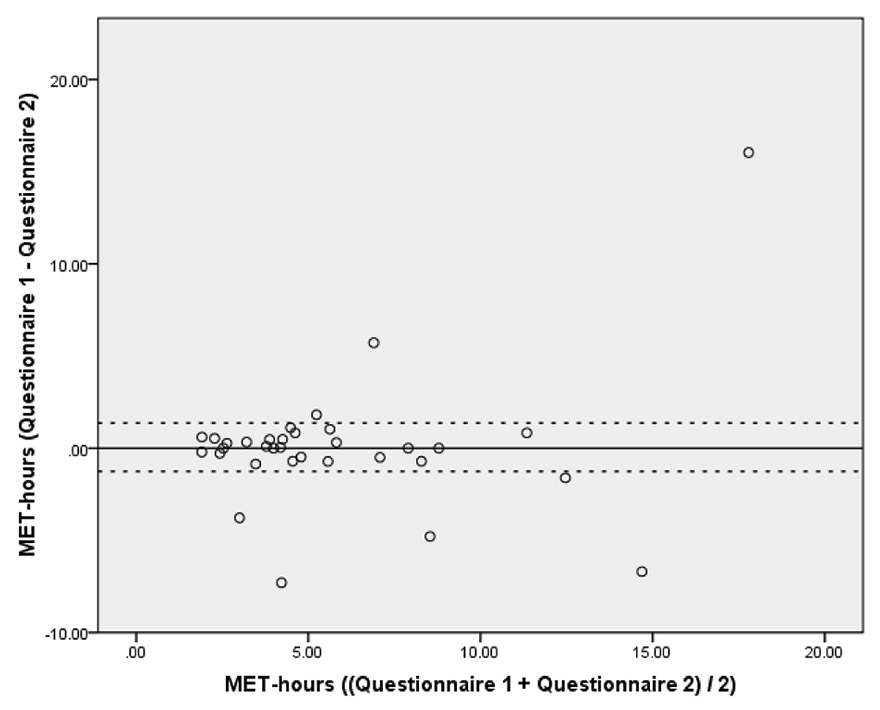 The test-retest analysis of this study resulted in a correlation of r = 0.62, with a mean difference between questionnaire 1 and 2 of 0.06 MET-hours per day. This indicates that the reliability of the PhA questionnaire was moderate to good. However, the confidence interval was relatively wide, primarily owing to six outliers, approximately a fifth of the questionnaires.
