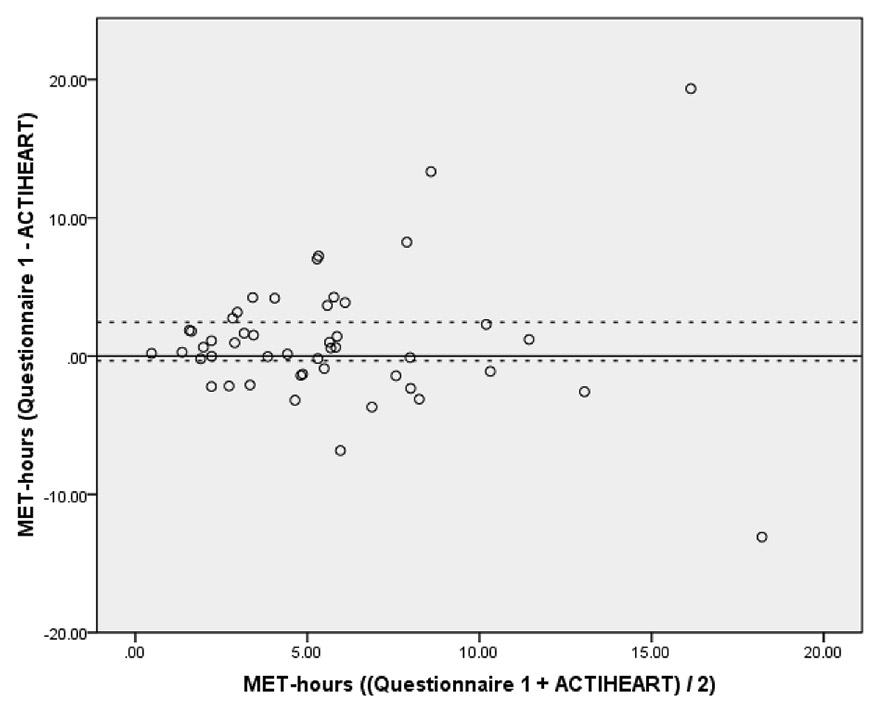 Bland-Altman plot of self-reported (questionnaire 1) minus measured (ACTIHEART) MET-hours (vertical axis) against mean of self-reported and measured MET-hours (horizontal axis). The solid horizontal line corresponds to the mean difference (1.05 MET-hours) while the dashed horizontal lines correspond to the 95% confidence interval (–0.34 to 2.44 MET-hours) (n = 48).