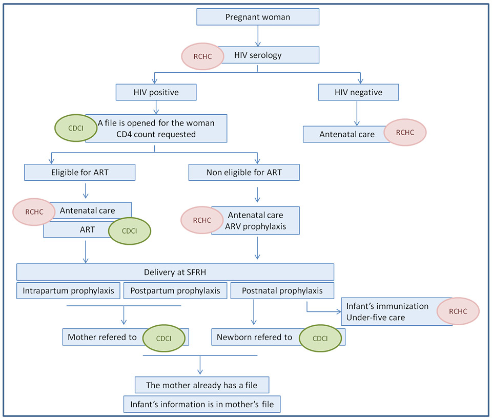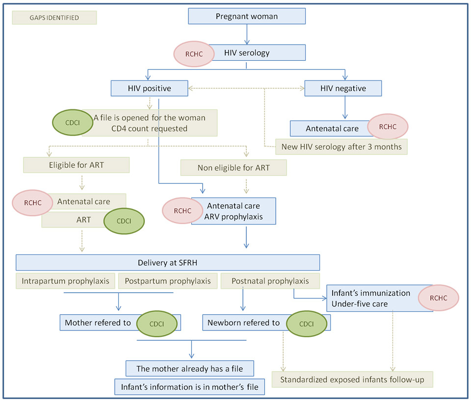 | CDCI | After being diagnosed HIV-positive, most pregnant women do not attend the CDCI, so CD4 count is not measured and ART eligibility is not assessed. | Pregnant women do not seem to feel comfortable attending the CDCI. According to the nurses’ interviews, they may feel ashamed because of stigma. | Integrate the care of HIV-positive pregnant women into the RCHC. Option B+ |