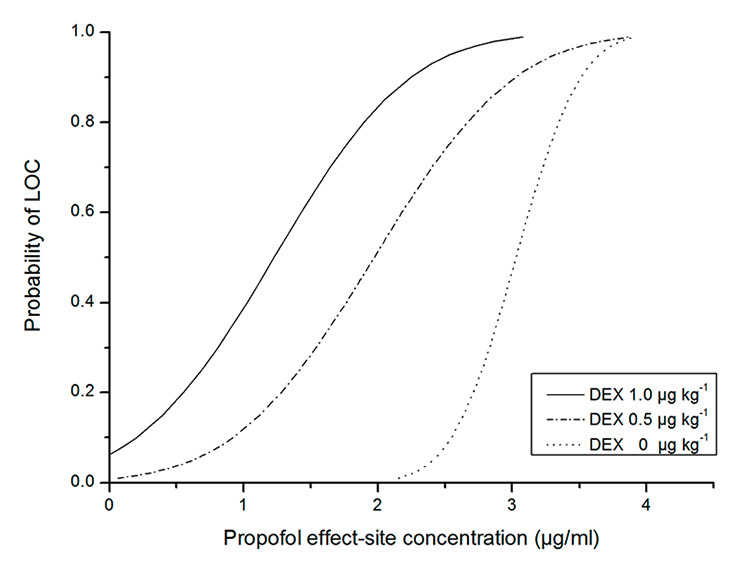 The relationship between the probability of loss of consciousness (LOC) and the propofol effect-site concentration. (DEX = dexmedetomidine.)