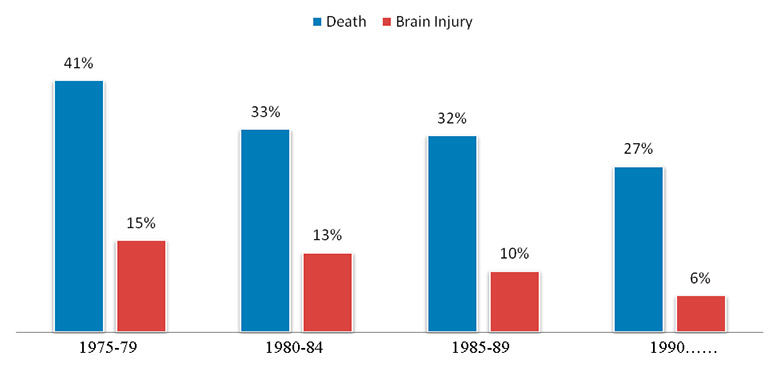 Anaesthesia-related morbidity, which includes all injuries caused by anaesthesia (except death), has largely followed the same trend. Even though data on morbidity are less trustworthy than mortality data (those most currently used are based on closed claims files), they clearly show that the rate of complaints for brain, heart and nerve damage has significantly decreased in the United States in the last thirty to forty years, as illustrated in figure 2 [25]. For example, complaints for injuries such as cardiac arrests following neuraxial anaesthesia have halved between 1970 and 1990 [26]. The same is true for awareness during obstetric anaesthesia, which decreased from 1.3% to 0.4% between 1982 and 1989 [27]. Claims for brain damage represented 15% of all claims in 1975, 13% in 1980, 10% in 1985 and 6% in 1990 [25, 28]. Data from the National Audit Projects (NAP) in the UK and from Swiss closed claims show, however, that brain and nerve injuries associated with difficult intubation and locoregional anaesthesia, respectively, still remain a challenge that has to be addressed [29–30].