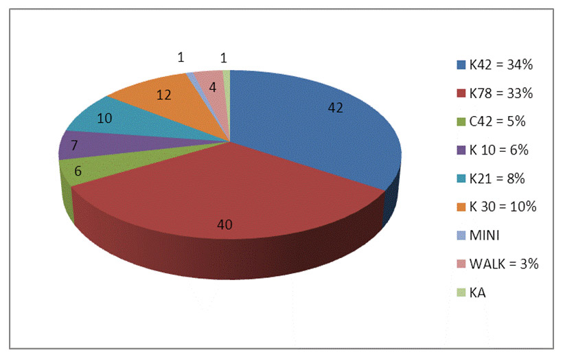 The average weekly training effort was 2 to 7 hours in the majority of athletes (n = 78; 63.4%), and 7 to 12 hours in 32 (26.0%) runners. Only a few athletes trained more than 12 hours per week (n = 5; 4.1%), while 6 (4.9%) athletes performed sports less than 2 hours per week prior to the race. These 6 athletes nevertheless competed in the K78 (n = 1), K24 (n = 2), C24 (n= 1), K21 (n = 1) and WALK category (n = 1). Most athletes (111 of 123 or 90.2%) had taken part in a long–distance running event equal to the Swiss Alpine Marathon previously, while 12 (9.8%) participated for the first time in such an event.