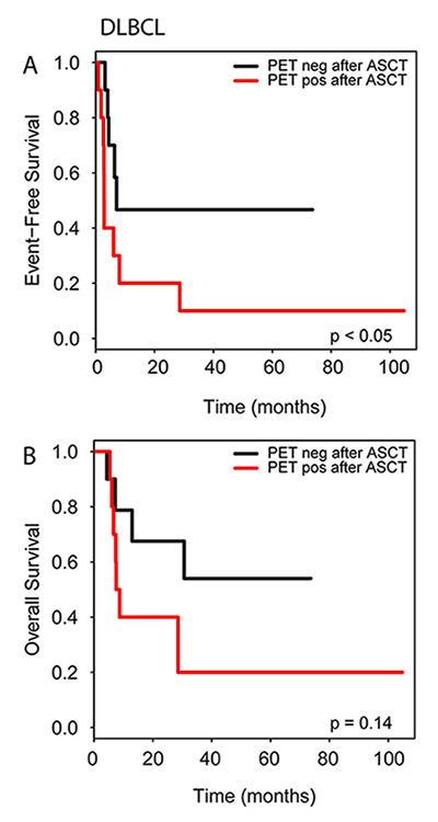 Impact of post-transplantation PET/CT on event free survival (A) and overall survival (B) in DLBCL patients.
