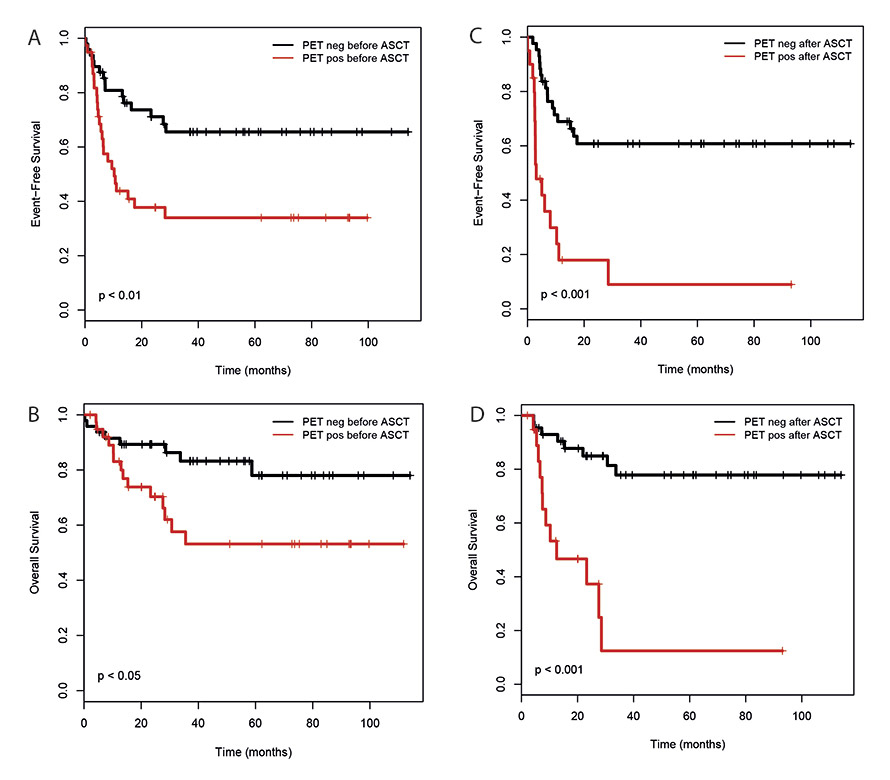 Impact of pre- and post-transplantation PET/CT on event free survival (A, C) and overall survival (B, D) in all patients. Pre-transplantation PET/CT was done during or after induction chemotherapy, post-transplantation PET/CT was done within 3 months after ASCT.