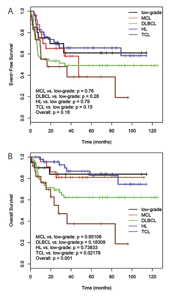 Event free survival (A) and overall survival (B) of the patients with respect to the different lymphoma subgroups.