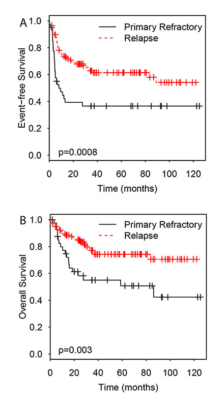 Sufficient follow-up data was available for all patients except for one female patient, who was lost 53 days after ASCT. She was from abroad and came to Switzerland only for the ASCT procedure. The median follow-up was 31 months (range, 0.29–136 months). The median EFS and OS were not reached until the end of follow-up for the whole patient collective. OS differed between patients with DLBCL, HL, mantle cell lymphoma (MCL), follicular lymphoma (FL) and T-cell lymphoma (TCL) significantly (p <0.001). TCL patients had a worse prognosis compared with the other lymphoma subtypes. No statistically significant differences were seen regarding EFS (fig. 2a, b). The 3-year EFS was 67% for HL patients treated with CBV predominantly from 2000 to 2005, and 65% for HL patients treated with BEAM as conditioning regimen from 2006 on. The corresponding 3-year OS were 88% and 82%, respectively. No differences were seen in HL patients treated in the late period with BEAM compared with the early period with CBV regarding initial lymphoma stage, length of CR before relapse or patient age. For DLBCL patients, 3-year EFS was 76% in the early period, and 27% in the late period. The corresponding 3-year OS were 76% and 54%, respectively. The patients with DLBCL treated during the early period with CBV tended to be younger than the DLBCL patients treated later with BEAM, although the difference did not reach statistical significance (p = 0.052). Patients with primary refractory disease had a statistically worse EFS and OS than patients with a relapse after response to initial treatment (3-year EFS 37% versus 63%, p = 0.0008; 3-year OS 55% versus 76%; p = 0.003) (fig. 3a, b). In contrast, no statistically significant survival differences were seen regarding the disease status before ASCT (CR/CRu versus less than CR: 3-year EFS 60% versus 51%, p = 0.12; 3-year OS 72% versus 69%, p = 0.58). Also no statistically significant differences were seen with regard to the duration of remission before relapse or the use of rituximab during salvage treatment.