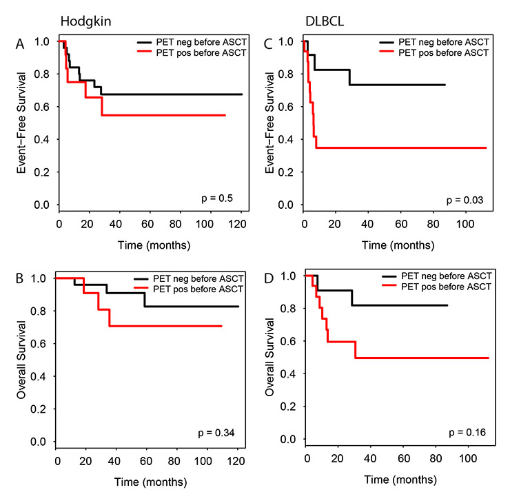 Impact of pre-transplantation PET/CT on event free and overall survival according to lymphoma entity. Hodgkin’s lymphoma (A, B) and DLBCL (C, D).
