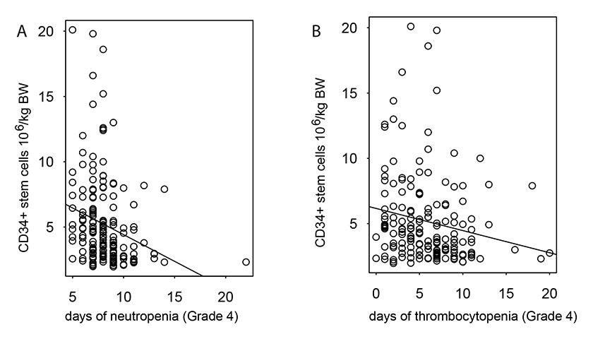 Correlation of the number of reinfused CD34+ stem cells with the length of neutropenias (r = –0.25, fig. A) and thrombocytopenias (r = –0.18, fig. B) after ASCT.
