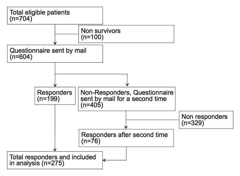 Three months (range 2–4 months) after hospital discharge we sent patients a systematic, validated questionnaire described below asking about satisfaction with the hospital stay and quality of life (see Appendix http://www.smw.ch/fileadmin/smw/pdf/smw-13790-Appendix.pdf ). To improve the return rate of the questionnaires, we re-sent it a second time to non-responding patients.