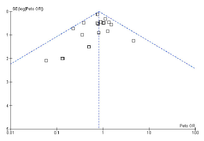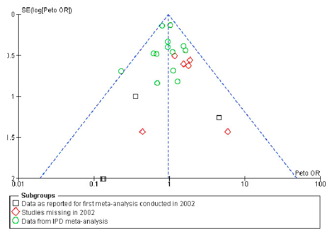 Funnel plot for overall survival based on data from our first meta-analysis [12] adding missing studies and using results from individual patient data review [27, 28].