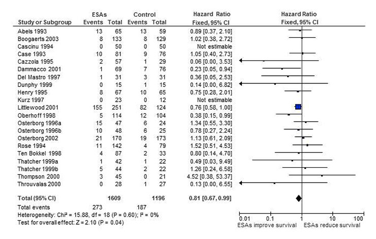 14 Bohlius J, Wilson J, Seidenfeld J, Piper M, Schwarzer G, Sandercock J, et al. Erythropoietin or darbepoetin for patients with cancer. Cochrane Database Syst Rev 2006;3:CD003407.