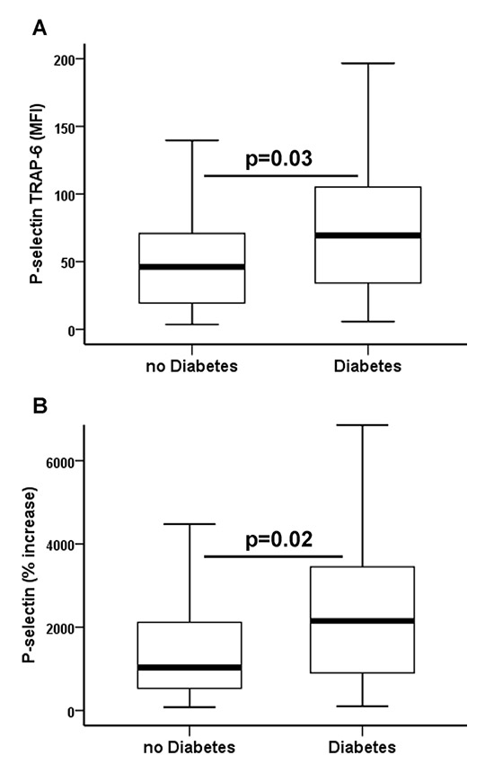 (A)Thrombin receptor activating peptide-6 (TRAP-6) inducible P-selectin (P-selectin TRAP-6) and (B) relative increase of platelet P-selectin (% increase) after activation with TRAP-6 in patients with coronary artery disease without and with type 2 diabetes. The boundaries of the box show the lower and upper quartiles of data, the line inside the box represents the median. Whiskers are drawn from the edge of the box to the highest and lowest values that are outside the box but within 1.5 times the box length. MFI = mean fluorescence intensity.