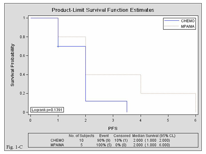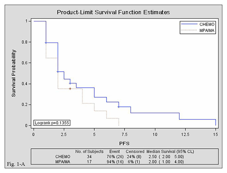 The two groups were well balanced in terms of patient age, disease-free survival, metastasis, number of metastases, and lines of salvage therapy (table 1). Mean patient ages in the MPA/MA (n = 17) and chemotherapy (n = 34) groups were 53.60 and 52.10 years, respectively. In the entire study sample, 70.59% of patients received 1st–6th-line therapy for metastatic disease. All patients in the MPA/MA group were treated with a single agent, and 38.23% (13/34) of patients in the chemotherapy group underwent combination chemotherapy.