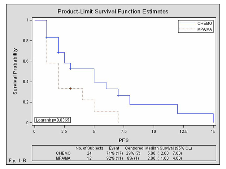All patients had target lesions, allowing the use of RECIST to evaluate objective responses. Therapeutic effects are presented in table 3. One case of CR and three cases of PR were observed in the chemotherapy group, but no such cases were documented in the MPA/MA group. More SD cases and fewer PD cases occurred in the chemotherapy group than in the MPA/MA group, but overall efficacy did not differ significantly between groups (rank-sum test, p = 0.076). Disease control rates were 52.94% (9/17) in the MPA/MA group and 73.53% (25/34) in the chemotherapy group (χ2test, p = 0.208). CB rates (CR + PR + SD ≥ 6 months) showed no significant difference between the MPA/MA and chemotherapy groups (11.76% vs. 29.41%; χ2test, p = 0.263). More than 35% of patients in each group showed at least 3 months of CB (CR + PR + SD ≥3 months). Patients in the MPA/MA group showed a marked response to treatment that continued for more than 7 months.