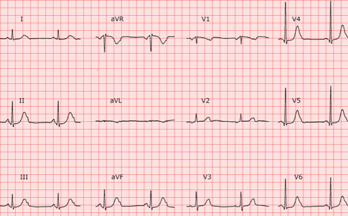 QRS: normal duration, increased amplitude from V4 to V6, normal axis.