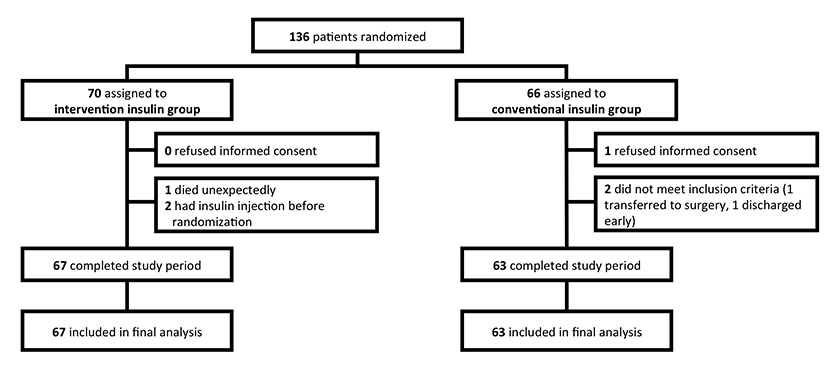 This was a prospective, randomised, controlled, open intervention trial performed at the Departments of Medicine of the University Hospital Basel and of the Bürgerspital Solothurn, Switzerland, from January 2007 to April 2010. In both hospitals acutely ill adult patients with a wide spectrum of medical conditions were hospitalised on the medical wards. Adult patients presenting to the emergency departments of either hospital with hyperglycaemia (defined as an initial plasma glucose level of >8.0 mmol/l) and with a presumed in-hospital stay of >48 hours were included. Patients were excluded if they were immediately admitted to the ICU, had clinical signs of shock, terminal illness requiring palliative care, type 1 diabetes mellitus or known pregnancy, or refused to give informed consent. Patients were randomised either to the intensive insulin group (intervention group) or to the conventional insulin group (control group). One-to-one randomisation was used by the two participating clinics with computer-generated lists produced by an independent statistician. Allocation was concealed by the use of sealed, numbered envelopes. Blinding of investigators with regard to group assignment of patients was not feasible, but investigators were unaware of aggregate outcomes during the study.